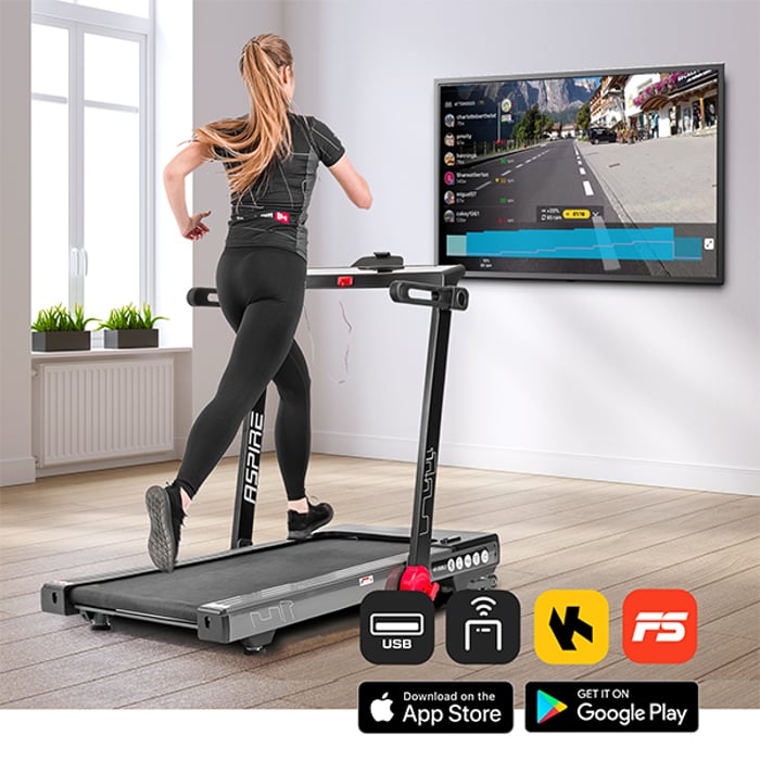 Pro zpestření cvičení doma využijte mobilní aplikaci FitShow, kompatibilní s běžeckým pásem Aspire. Aplikace je zdarma, dostupná pro Android a IOS. V nabídce jsou tréninkové programy a FitShow vám navíc umožní ukládat váš pokrok. Průběh tréninku lze sledovat na tabletu, chytrém telefonu nebo na televizní obrazovce.