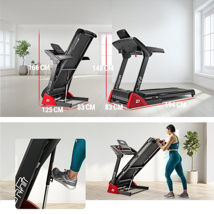 Na běžeckém pásu Integra můžete trénovat bez obav z přetížení kloubů. Tento model je vybaven tlumícími polštáři vyrobenými v technologii Dual-Cushion, které chrání klouby a minimalizují riziko zranění. Takový tlumící systém výrazně snižuje hladinu hluku během používání zařízení - zabraňuje také přenosu vibrací z běžeckého pásu na podlahu.