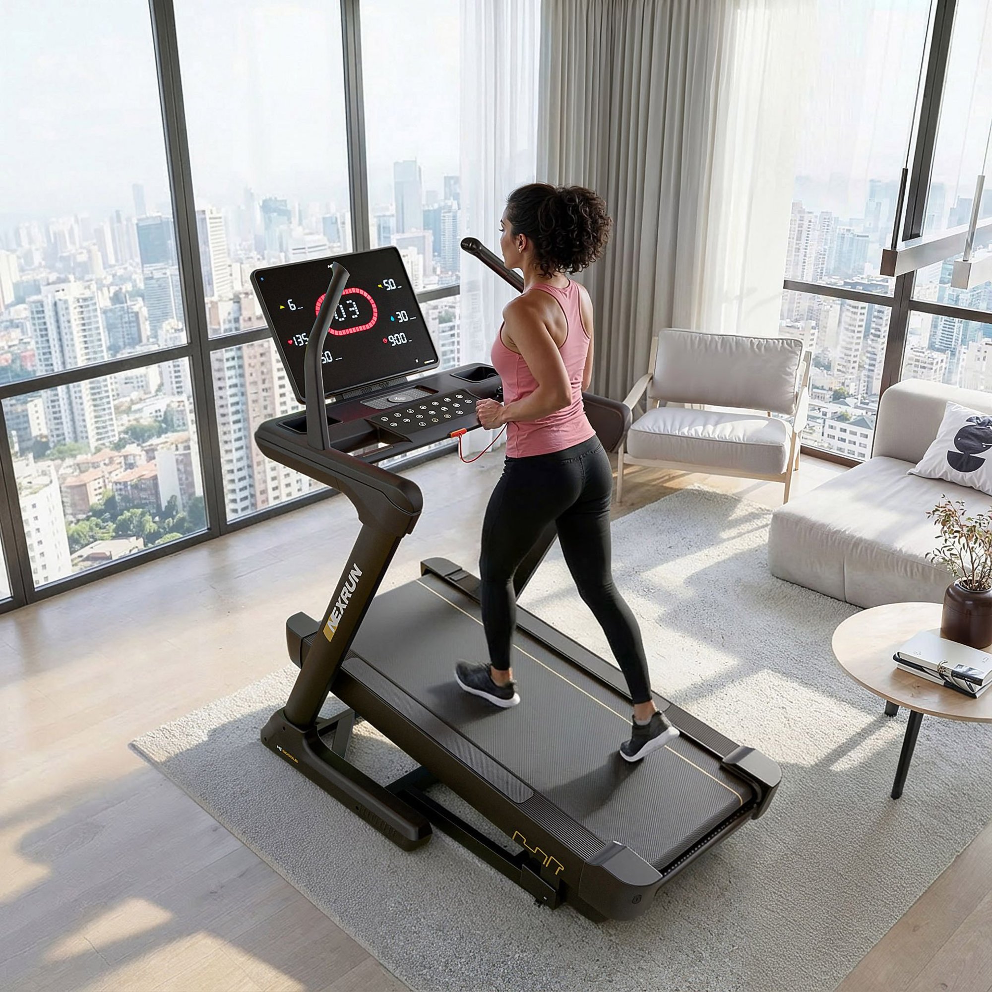 Tento běžecký pás Nexrun je vybaven velkým moderním tréninkovým počítačem, který Vám dává plnou kontrolu nad tréninkem. Na přehledném displeji zkontrolujete například čas, vzdálenost, spálené kalorie, aktuální rychlost, tep, úhel sklonu běžecké plochy i úroveň tělesného tuku. Další výhodou je okénko se stupnicí, které ukazuje aktuální intenzitu rychlosti v procentech, a praktický režim spánku. Vestavěné senzory tepu, bezpečnostní klíč a USB-C port pro připojení zařízení zajišťují pohodlný a bezpečný trénink. Na madlech najdete tlačítka pro rychlé nastavení rychlosti i sklonu, takže máte vše doslova po ruce.