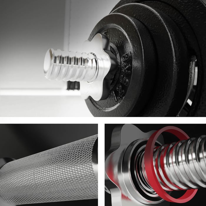 Mimořádně odolná hřídel z chromované oceli je vybavena vroubkovanou úchopovou částí, která zvyšuje bezpečnost cvičení tím, že zabraňuje sklouznutí rukou během intenzivního tréninku. Závitové konce umožňují rychlé a bezproblémové nasazení závaží s otvorem o průměru 31 mm a speciální matice zajišťují kotouče na hřídeli. Pro ještě vyšší bezpečnost vašeho tréninku jsme do sady přidali neoprenové rukavice v univerzální velikosti, které zaručují pevný a pohodlný úchop.