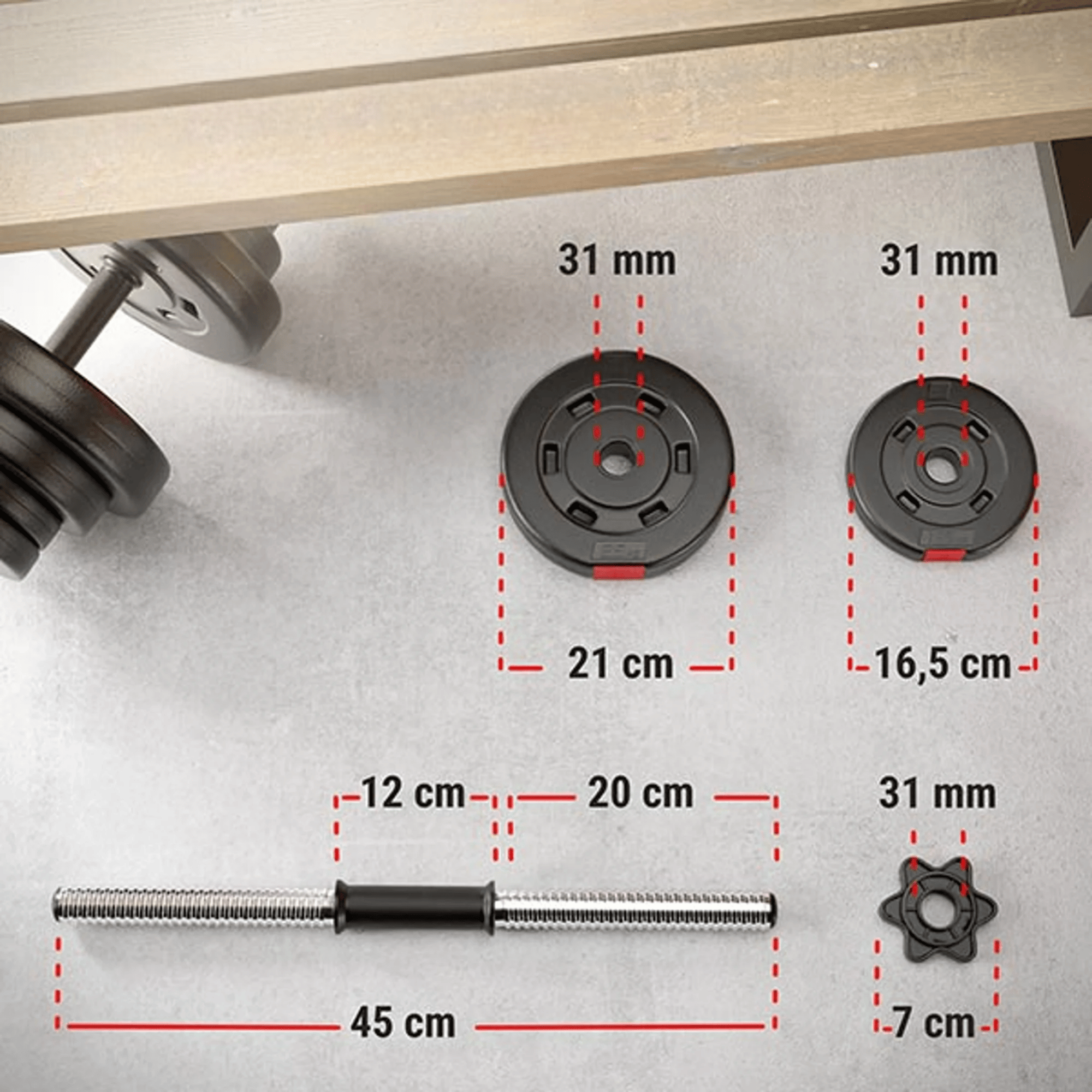 Hřídel o délce 45 cm umožňuje umístění optimálního počtu kotoučů pro efektivní silový trénink. Bitumenová závaží s univerzálním průměrem otvoru 31 mm pevně sedí na hřídeli a odpovídající matice účinně přitlačují kotouče, takže se závaží nepohybuje ani během intenzivního cvičení.