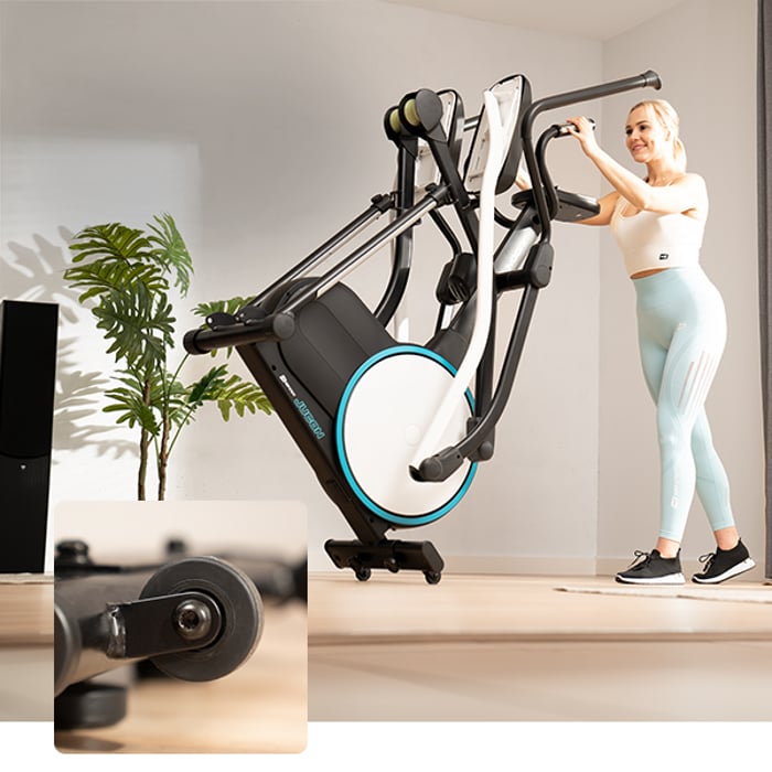 Magnetický eliptický trenažér Jucon je fitness zařízení určené pro domácí použití. Z tohoto důvodu jsme jej vybavili pohodlným a rychlým skládacím systémem, který vám umožní ušetřit místo ve vaší domácnosti. Po tréninku můžete kolejnice zvednout do svislé polohy, zajistit je zámky a poté pomocí transportních koleček pohodlně přemístit zařízení do jiné místnosti.