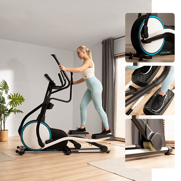 Každá z rukojetí eliptického trenažéru HS-250CF Jucon umožňuje různé postavení rukou a tím zapojení do práce různých svalových skupin během tréninku. Menší úchopy slouží k přepracování spodních částí těla, zejména nohou a hýždí. Velké rukojeti o šířce až 83 cm dávají možnost maximální aktivace svalů ramen, a tím provádět dynamický kardio trénink. O hladký a tichý chod zařízení se stará systém magnetického odporu na bázi 24 kg setrvačníku.