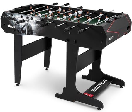 Stolní fotbal Sector je díky své konstrukci jako stvořený pro dynamické hry . Široké nohy stolu zvyšují stabilitu stolního fotbalu . Vyrovnávací nožičky umístěné pod nohama stolu umožňují efektivní přizpůsobení stolu k podlaze . Stolek je možné složit tak , aby během přestávek nezabíral místo.