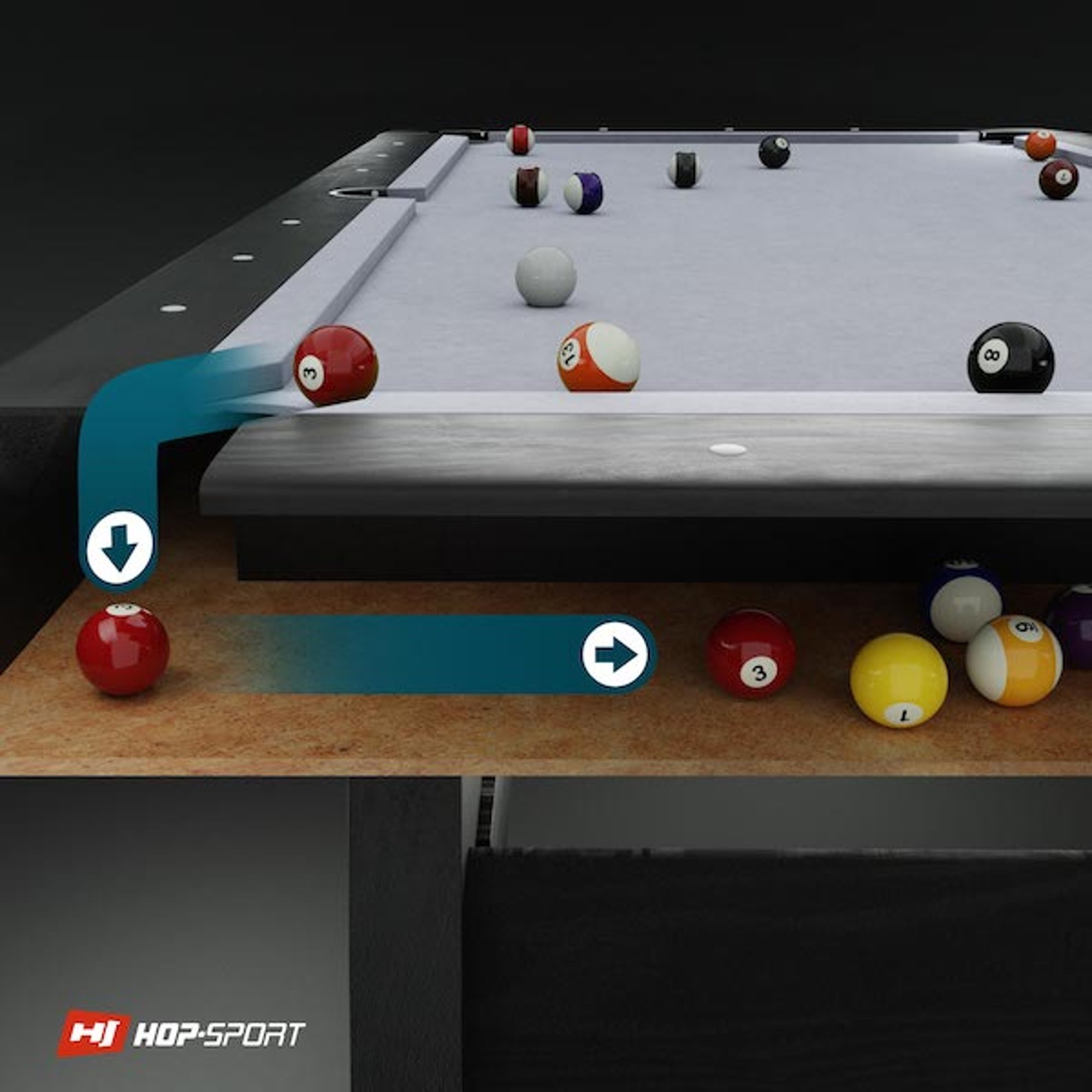 Díky tomuto praktickému systému se kulečníkové koule shromažďují na jednom místě pod hrací plochou. Kapsy z tvrzené gumy a sběrná nádoba na koule jsou vystlány měkkou pěnou, která tlumí hluk při dopadu a kutálení koulí.