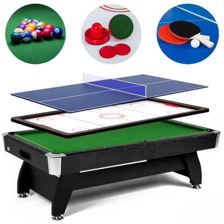 Černý kulečníkový stůl se zeleným suknem, 8 ft, s oboustrannou deskou pro stolní tenis a air hokej. Veškeré potřebné příslušenství je součástí balení.