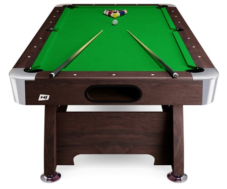Kulečníkový stůl Vip Extra 8 ft v hnědo/zelené barvy, kompletní s veškerým příslušenstvím pro hru a gratisi. Kompatibilní s jinými nástavci stolů značky Hop-sport.