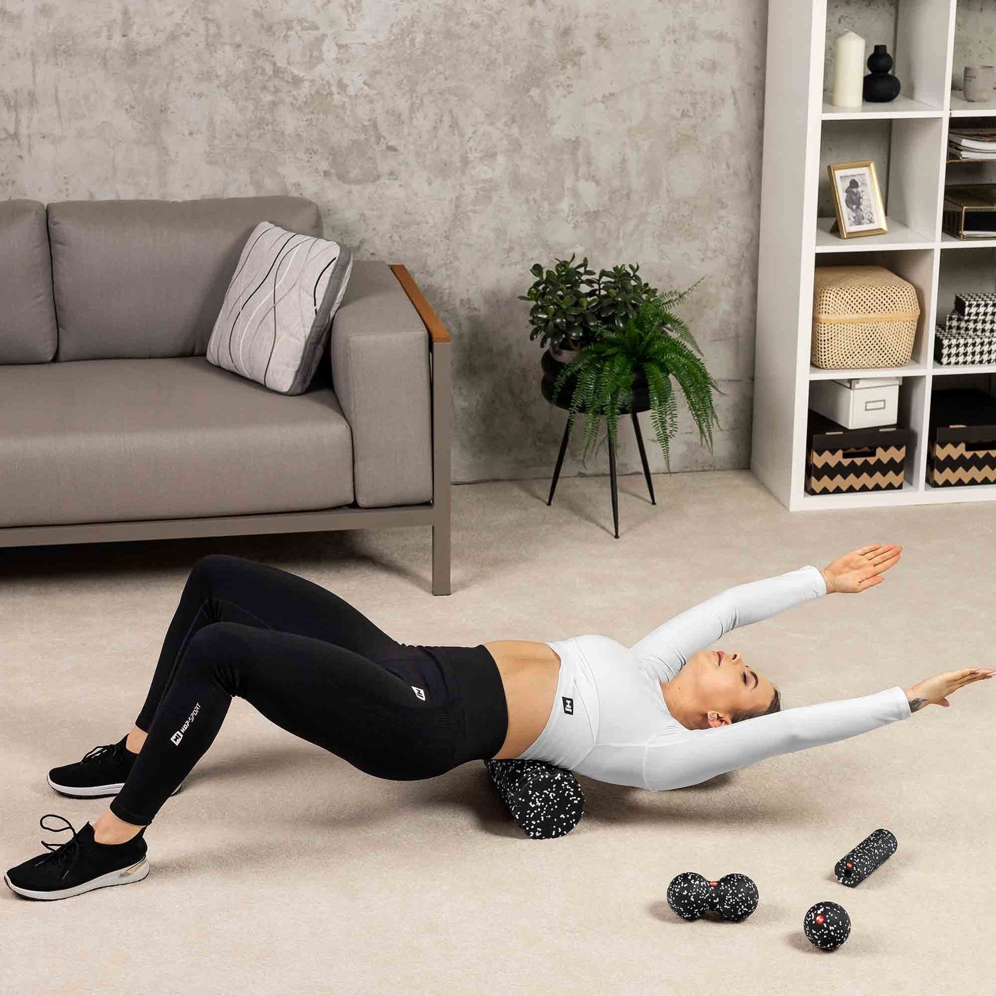 Sada příslušenství pro masáž celého těla v černé a bílé barvě. Ideální pro uvolnění svalů po tréninku, zmírnění bolesti a snížení stresu.