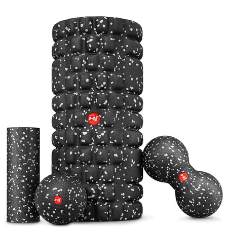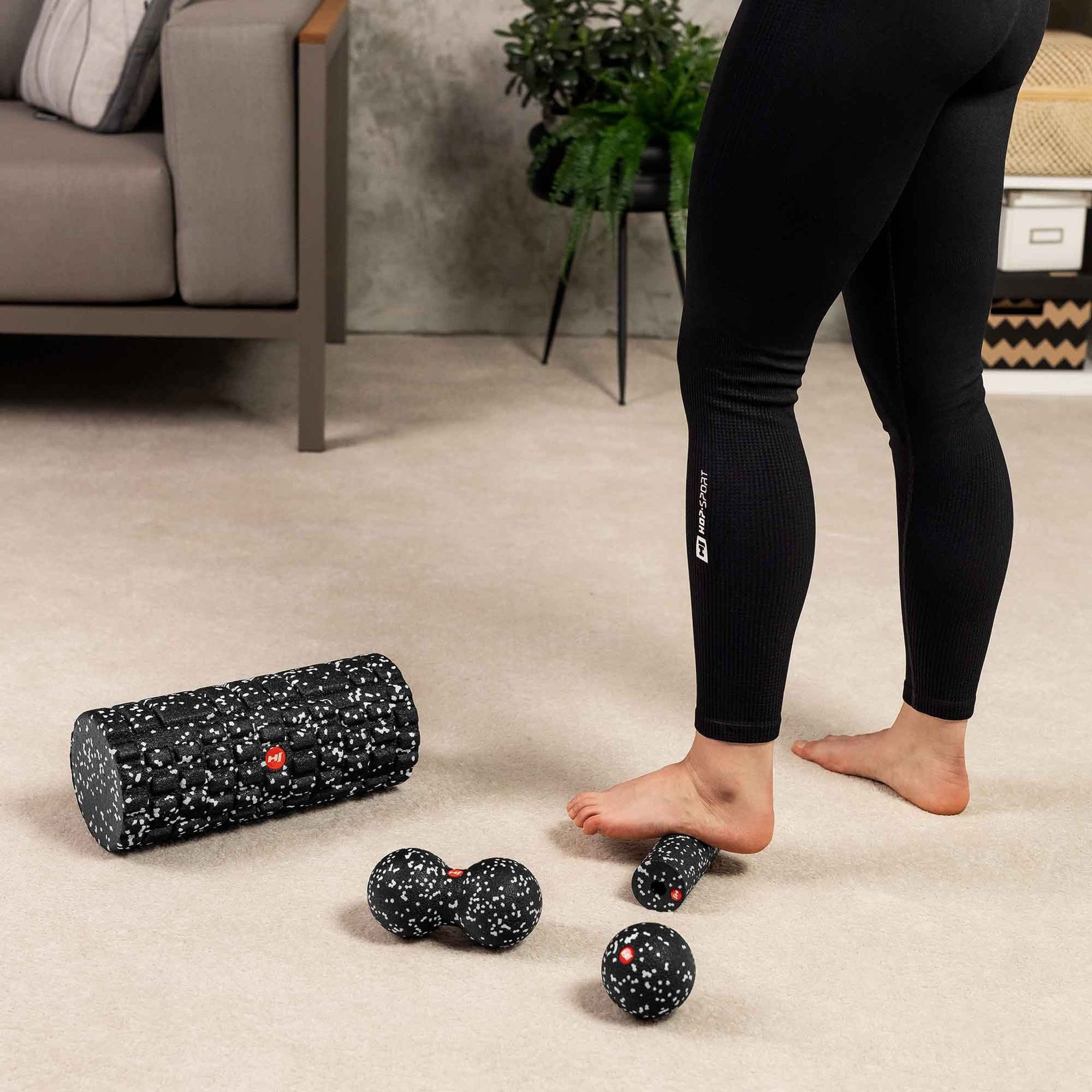 Sada černobílých masážních doplňků skládající se z válečku, mini válečku, masážního míčku a duo míčku je kompletní sadou, která vám umožní masírovat všechny svaly vašeho těla. Různé tvary a velikosti jednotlivých doplňků v sadě zaručují dokonalé přizpůsobení vybraným partiím těla, kde cítíte napětí nebo bolest. Velký váleček se bude skvěle hodit na masáž zad, duo míček bude nenahraditelný při masáži šíje a mini váleček skvěle promasíruje Achillovy šlachy. Vyrobeno z pevných materiálů, které jsou šetrné k pokožce a zajišťují pohodlí a bezpečnost používání.