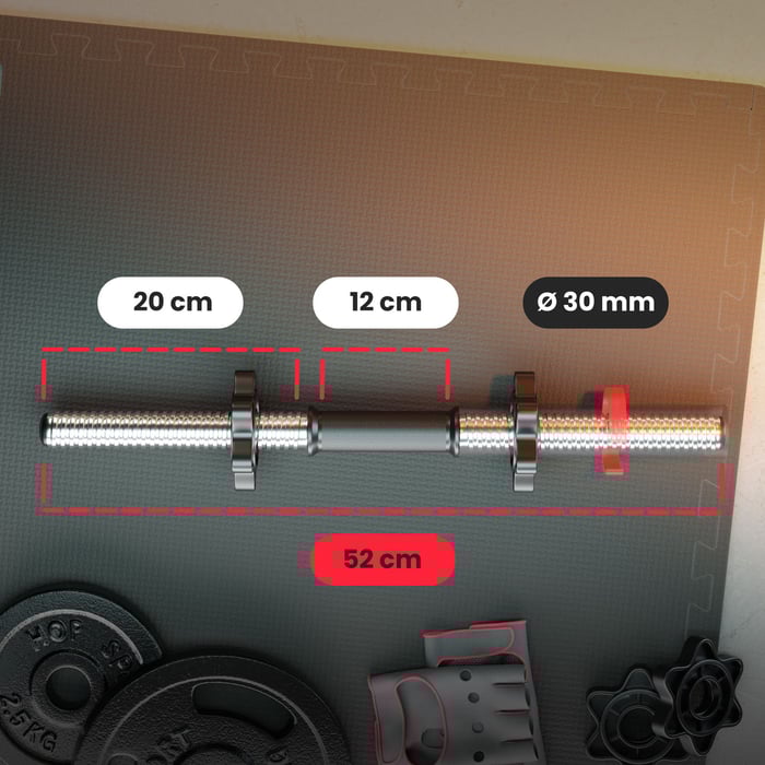 Profesionální hřídel o délce 52 cm pokrytý chromem se závity a bezpečnostními objímkami. Díky závitovým koncovkám je naložení závaží rychlé a jednoduché. Závaží zablokujete pomocí bezpečnostní objímky. Vroubkovaná rukojeť zaručuje bezpečné a stabilní uchopení během posilování. Tento univerzální hřídel pro jednoruční nakládací činku je vyroben z vysoce kvalitního materiálu.