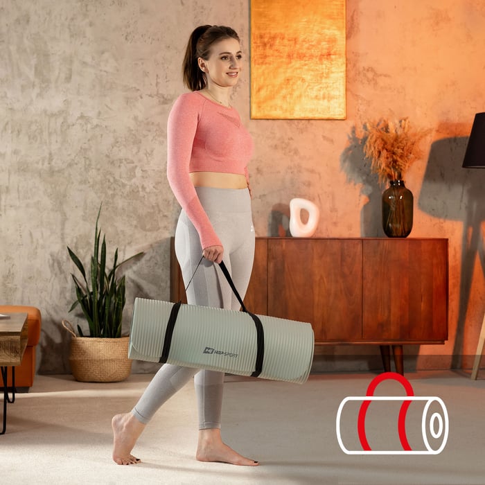 Fitness podložku Hop-Sport si snadno vezmete s sebou na hodiny jógy nebo fitness, do parku nebo na pláž. Nepotřebujete k tomu speciální tašku ani pouzdro. Gymnastická podložka NBR o tloušťce 1,5 cm je dodávána s popruhem na přenášení, takže si podložku můžete vzít kamkoli s sebou.