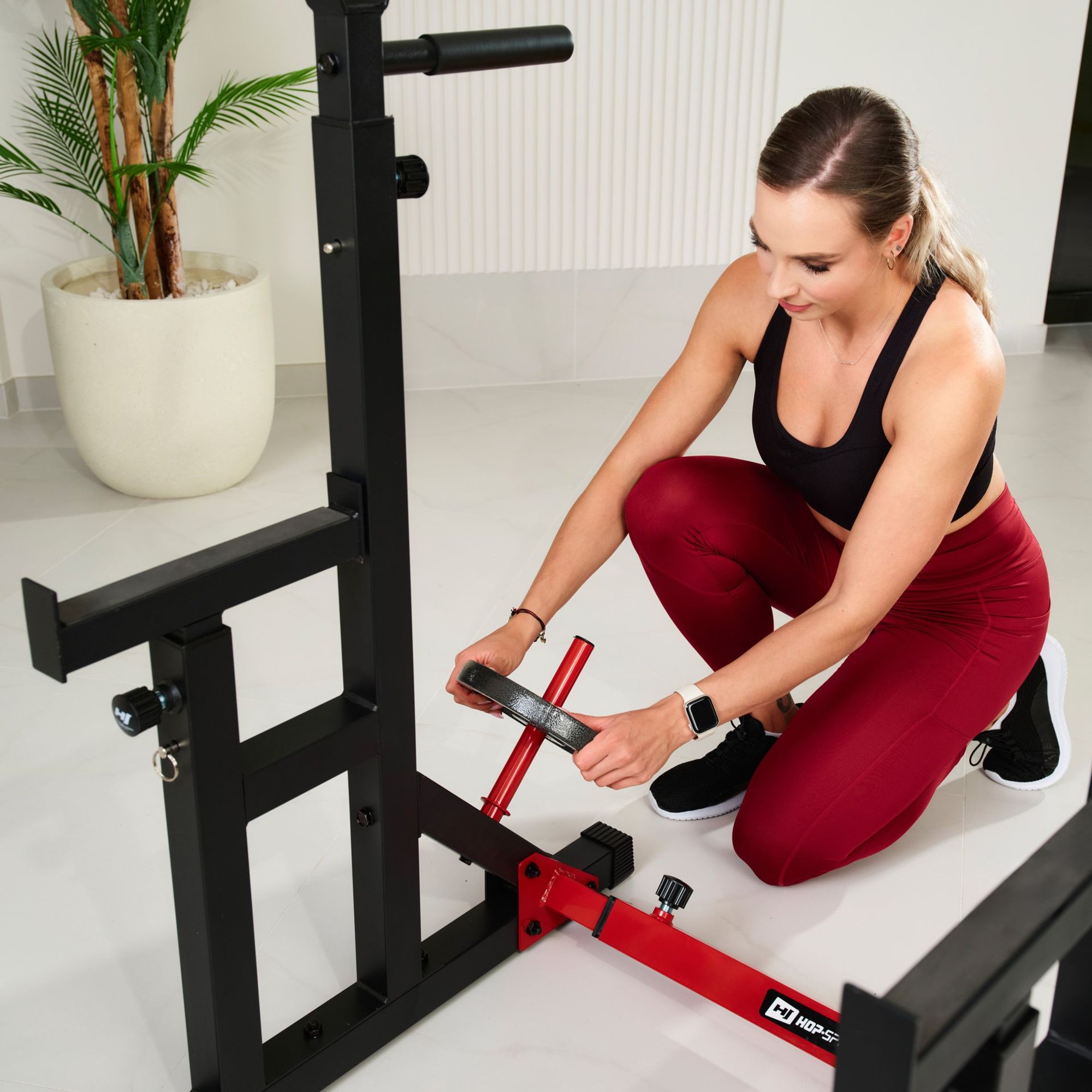 Nastavitelné stojany na činky Hop-Sport s bezpečnostním mechanismem a držáky na kotouče. Stabilní a kompaktní konstrukce je ideální pro domácí cvičení a zajišťuje pohodlí i bezpečnost.