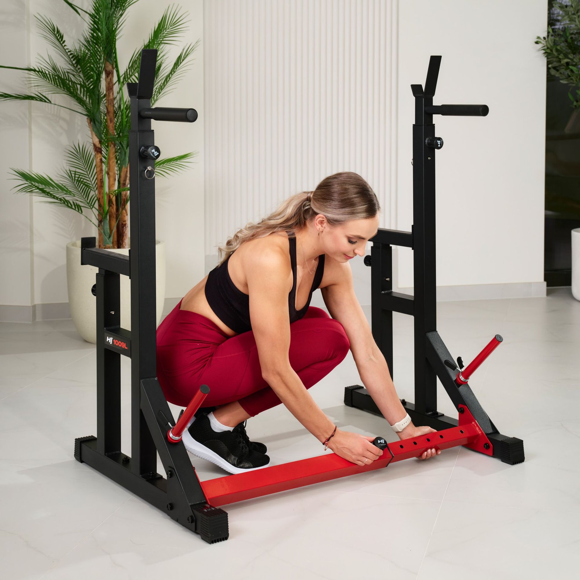 Stojany na činky HS-1009L jsou solidní vybavení. Vyrobeno z odolné oceli s profilem 50x50 mm, zajišťují stabilitu a pevnost i během intenzivních sérií. Nohy s protiskluzovou základnou přilnou k podlaze – ať už trénujete na podložce, podlaze nebo betonu v garáži. Nastavitelná šířka od 72 do 120 cm vám umožňuje přizpůsobit postoj délce tyče a osobním preferencím. Nosnost až 200 kg zaručuje odolnost – tento stojan na činky s hrazdou zvládne i ty nejintenzivnější tréninky.