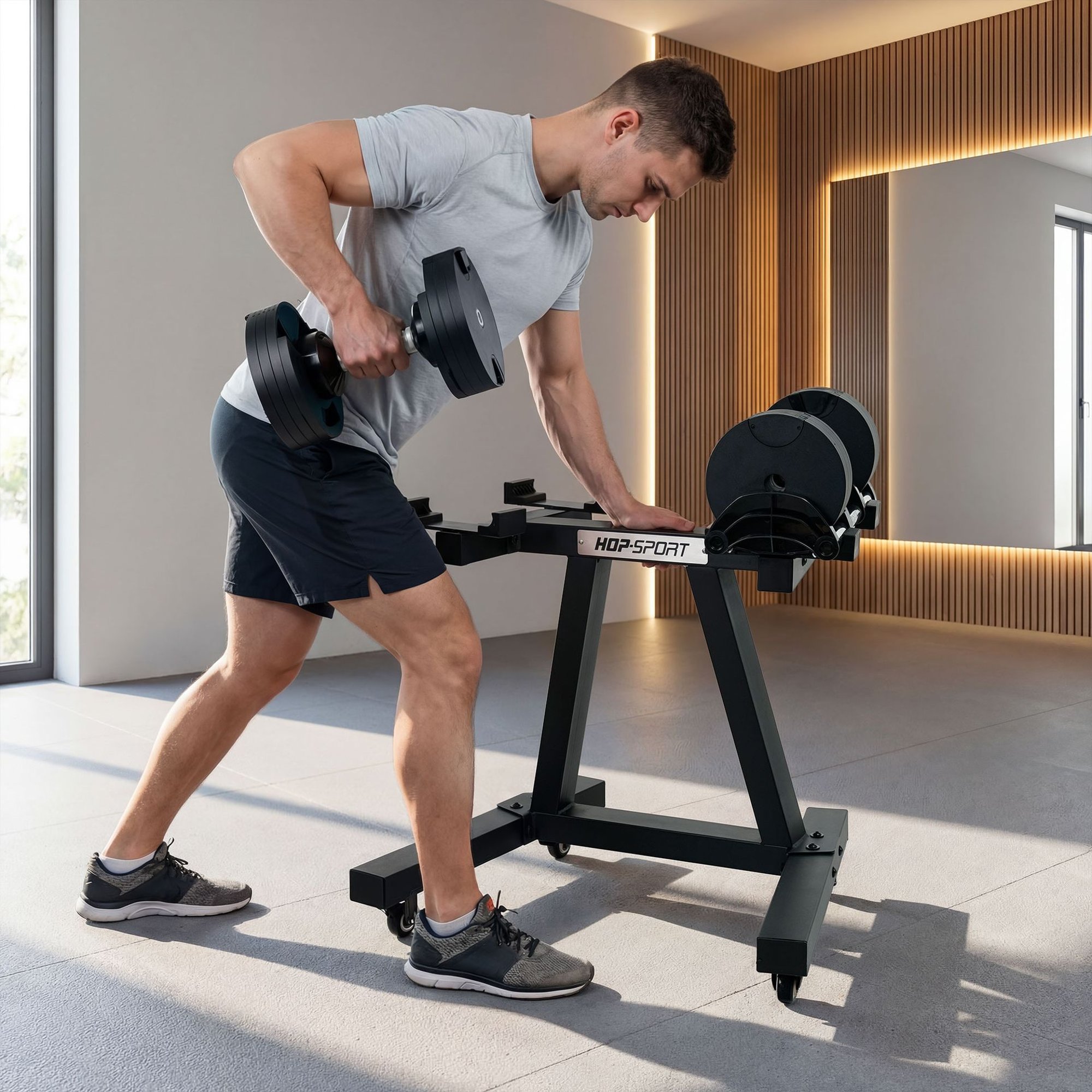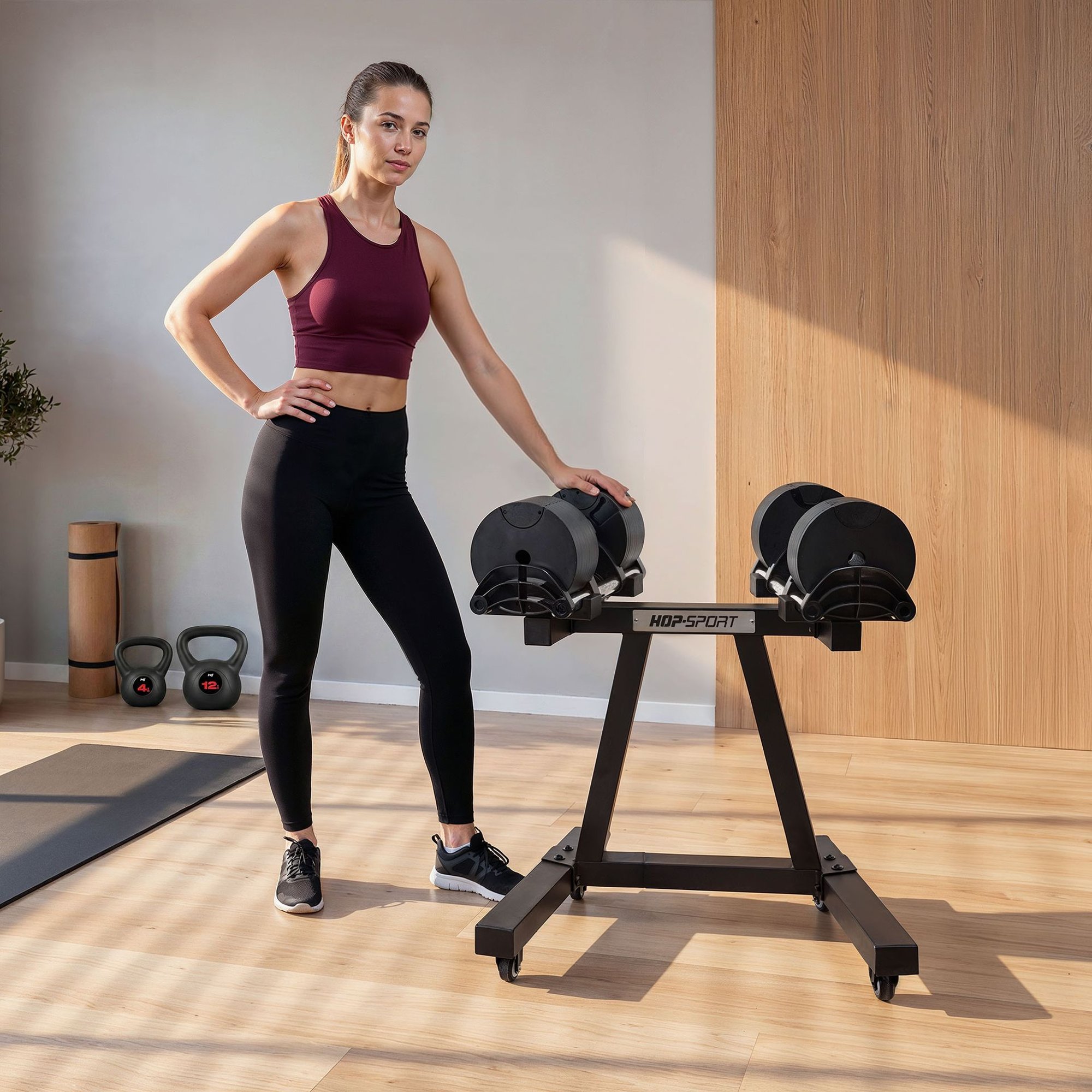 Stojan na nastavitelné činky HS-3040A je stabilní a funkční řešení pro Vaši domácí posilovnu. Vyrobený z odolných ocelových profilů 50 × 50 mm, práškově lakovaných, zajišťuje nosnost až 150 kg. Široká základna a lichoběžníkové uspořádání polic garantují bezpečnost i pohodlí při odkládání činek bez nutnosti ohýbat se. Čtyři podpěry s ochrannými krytkami chrání činky, zatímco kolečka s brzdou umožňují snadné přemístění. Kompaktní, snadno sestavitelný, kompatibilní s činkami Hop-Sport HS-TG3040D – udrží Vaše činky vždy v perfektním pořádku.