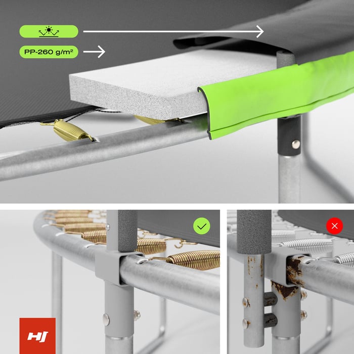 Klíčovým prvkem trampolíny jsou 178 mm dlouhé pozinkované pružiny. Jsou zodpovědné za vynikající pružnost podložky, umožňující vysoké a dynamické skoky.