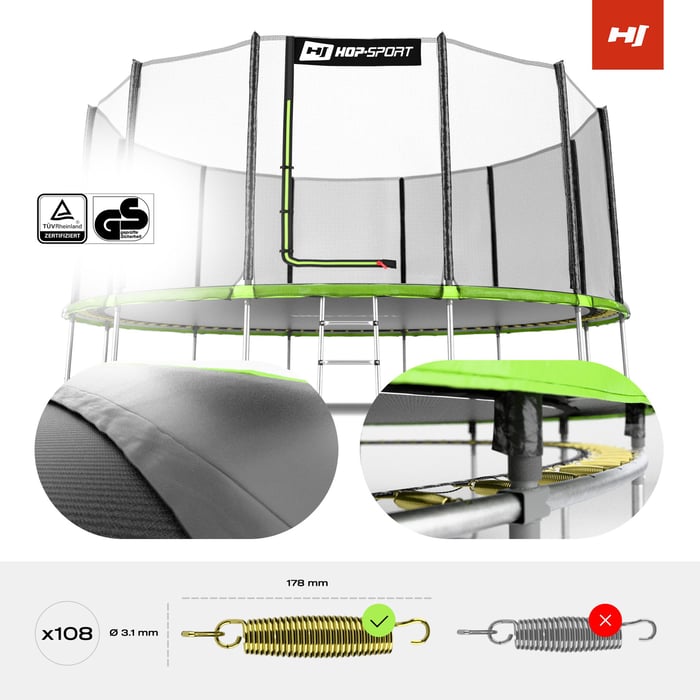 Trampolína Hop-Sport je synonymem nejvyšší kvality a bezpečnosti, což potvrzuje prestižní certifikát TUV. Jeho pevná konstrukce je vyrobena z pozinkované tvrzené oceli, která zajišťuje nejen stabilitu při těch nejenergičtějších skocích, ale také zaručuje odolnost proti korozi a mechanickému poškození. Díky tomu si trampolína zachová své vlastnosti po mnoho sezón a poskytne spoustu zábavy pro celou rodinu.