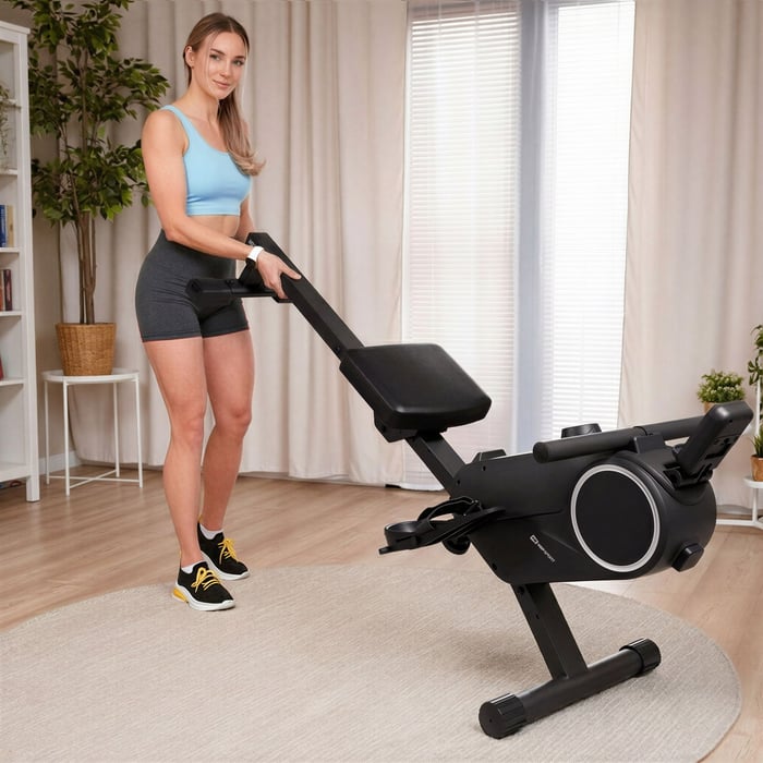 Magnetický ergometr Creek je skvělé řešení pro ty, kteří chtějí cvičit doma, ale nemají mnoho prostoru. Díky kompaktním rozměrům a možnosti vertikálního skladování jej po tréninku bez problémů postavíte do rohu nebo za skříň. Transportní kolečka usnadňují přesouvání stroje, takže jej bez námahy přemístíte tam, kde Vám to nejvíce vyhovuje. Tréninkový veslovaci trenazer Creek spojuje pohodlí, funkčnost a elegantní vzhled, takže se skvěle hodí do každého domácího interiéru.