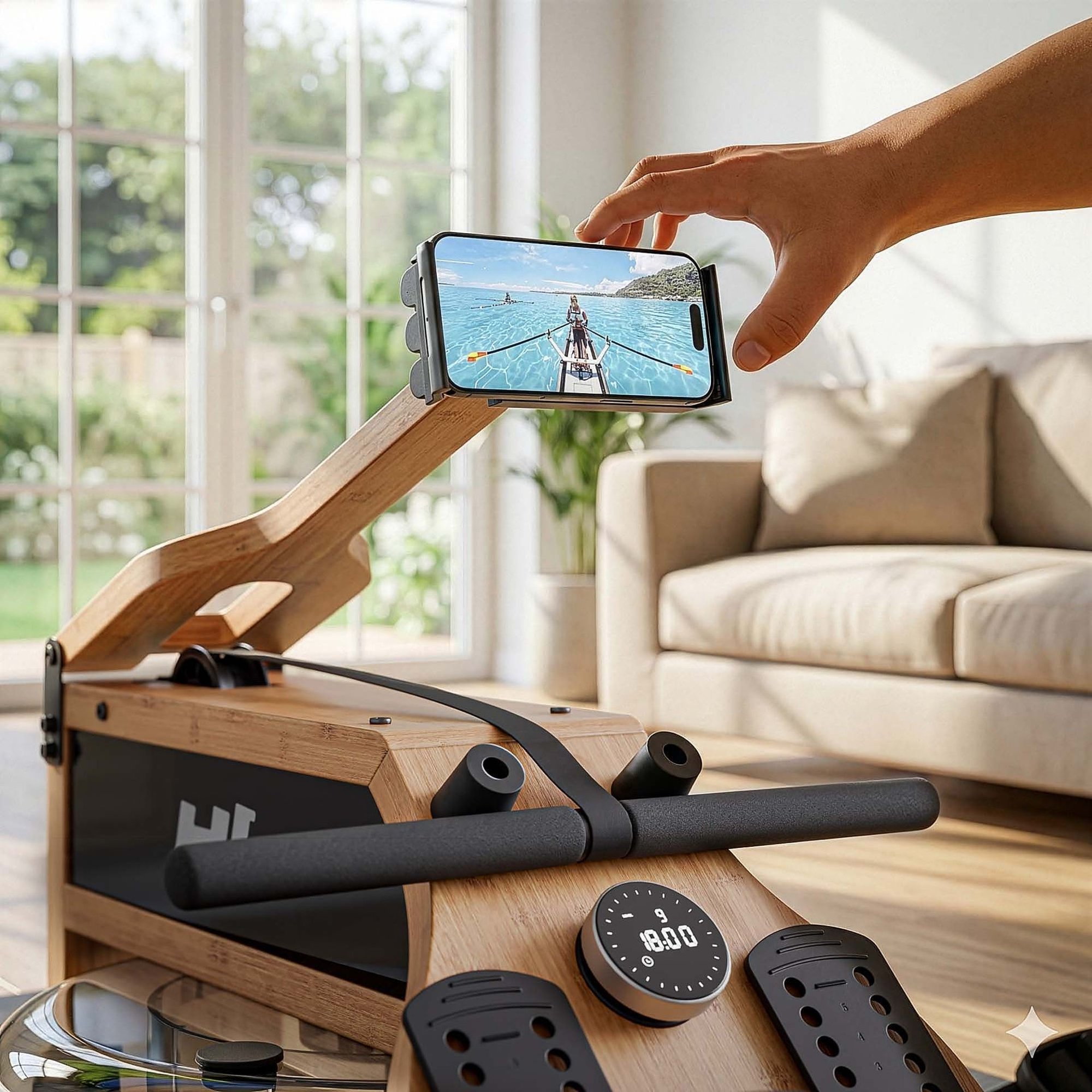 Vodní veslařský trenažér HS-200WR Aquen je zařízení určené pro domácí trénink. Je vybaven moderním tréninkovým počítačem, který zobrazuje tempo, rychlost, vzdálenost, počet záběrů, spálené kalorie a stav Bluetooth. Díky kompatibilitě s aplikací Kinomap můžete soutěžit na virtuálních tratích a plánovat své tréninky. Magneticko-vodní setrvačník s 32 úrovněmi odporu zajišťuje realistický pocit veslování a zapojuje celé tělo – paže, záda, nohy i břicho. Trenažér je tichý, kompaktní a bambusový rám mu dodává eleganci. Je skládací, vybavený transportními kolečky a nastavitelným držákem na telefon, takže se vejde do každého bytu.